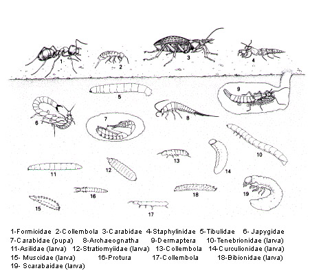 gama de insetos, especialmente: detritívoros, predadores, micófagos,