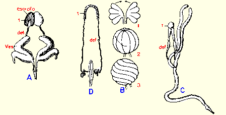 Orgãos genitais masculinos de: A, Vespa germanica; B, esquema da união dos testículos para formacião de um testiculo aparente em lepidópteros; C, Smerinthus populi (Sphingidae); D, Dictyopteryx microcephala (Placoptera). Weber (1933).
